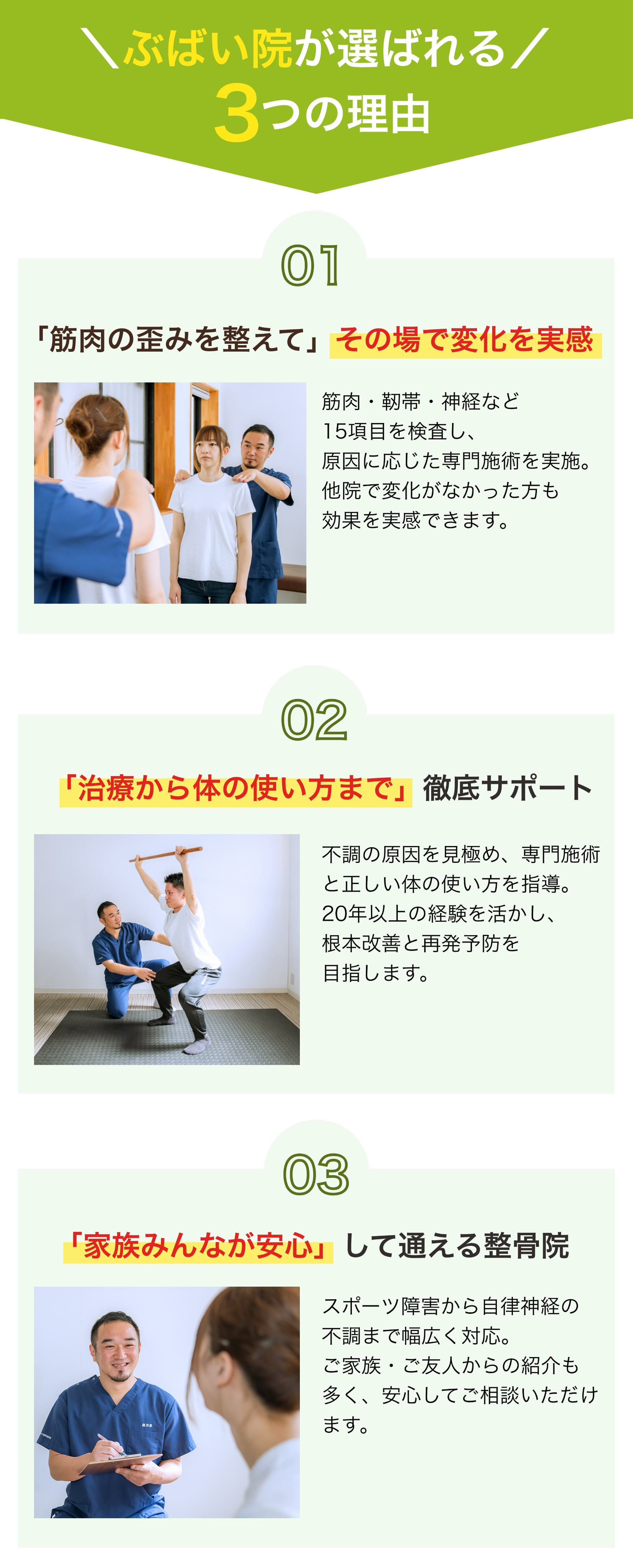 問診票に基づいて、お話を伺います。その後、お体の状態を検査や動きにて確認させていただきます。ご自身の体についてご理解いただけるように、わかりやすい言葉での説明を心がけていますが、不明な点はどんどんご質問ください。