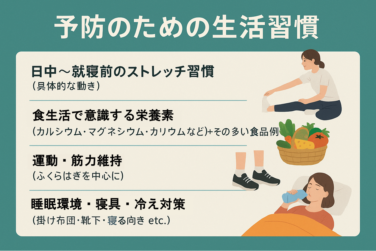 夜足がつるのを防ぐには、睡眠環境も大きく影響すると考えられています。掛け布団を調整して体を冷やさないようにしたり、必要に応じて靴下を履いたりすると冷えを和らげられると言われています。また、寝具の高さや硬さが体に合わないと筋肉が緊張しやすくなるため、枕やマットレスを見直すのも一つの方法とされています。