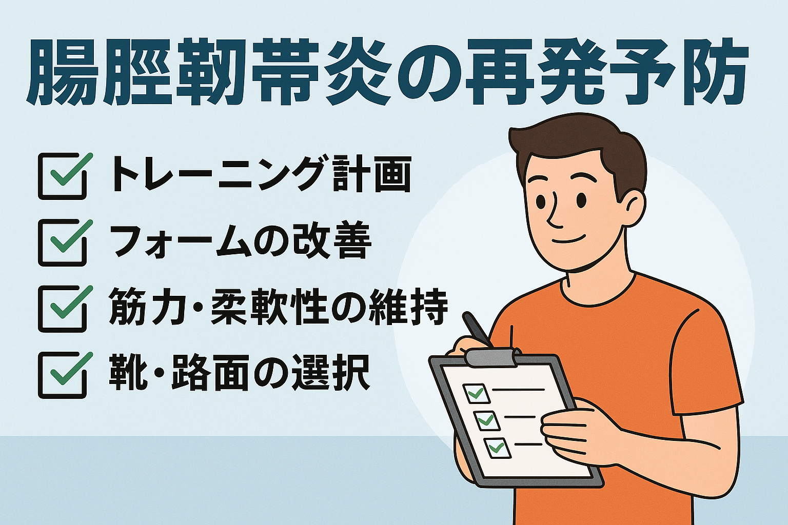 つまり腸脛靭帯炎は単純に「走りすぎ」で起きるものではなく、体の使い方や環境要因が絡み合って起こる症状です。自分自身のフォームや筋力状態を振り返ることが、予防や改善の第一歩につながるでしょう。