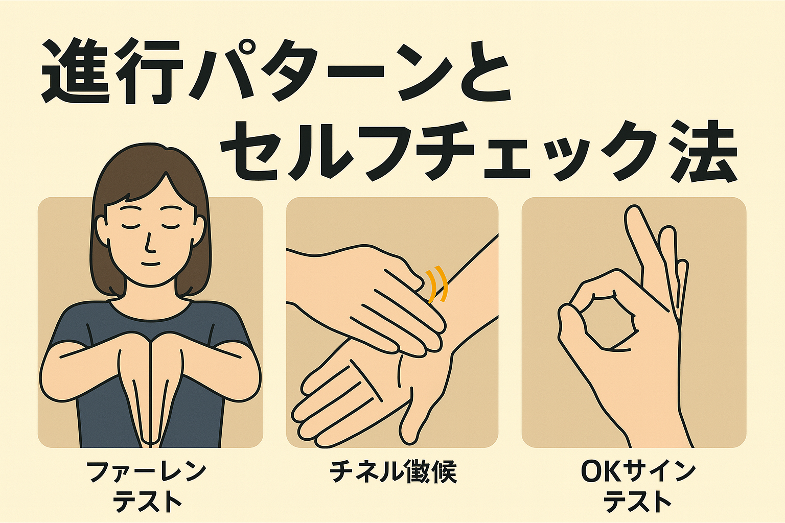 また、既往歴(手首の外傷、骨折歴など)、全身疾患(糖尿病・甲状腺異常・関節リウマチなど)、むくみ傾向、勤務や手作業内容など生活背景も重要になります。