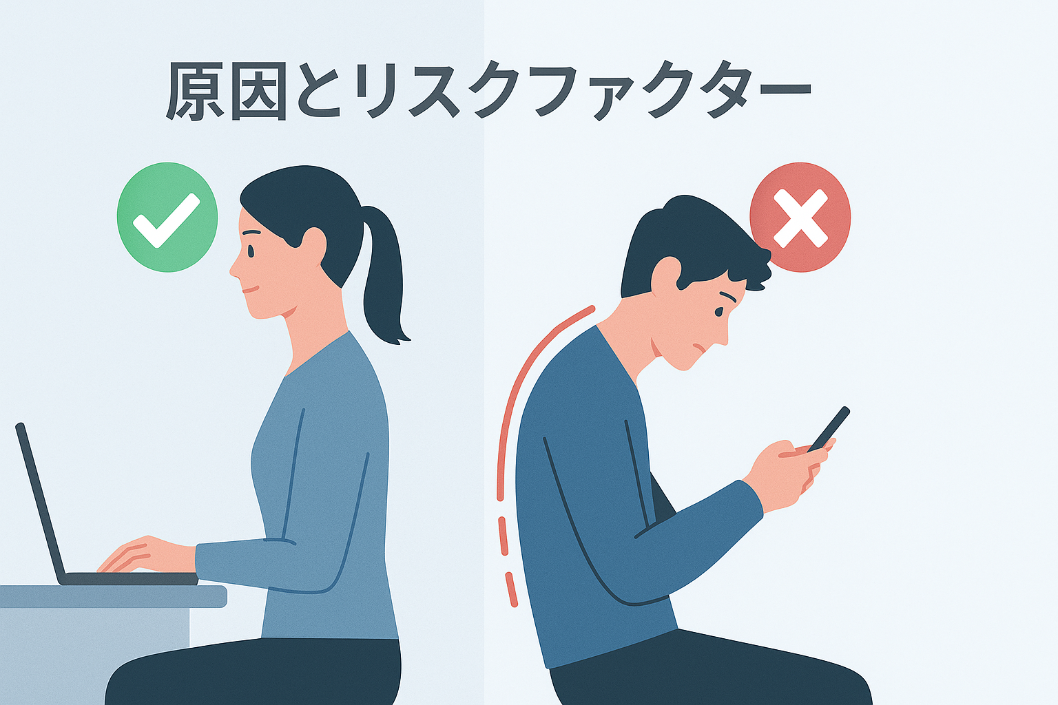 たとえば、スマートフォンやパソコンを長時間使うとき、つい画面をのぞき込むようにうつむく姿勢になりがちですよね。この姿勢を続けることで、首が前に出て頚椎(けいつい)の自然なカーブが少しずつ失われていくとされています。
