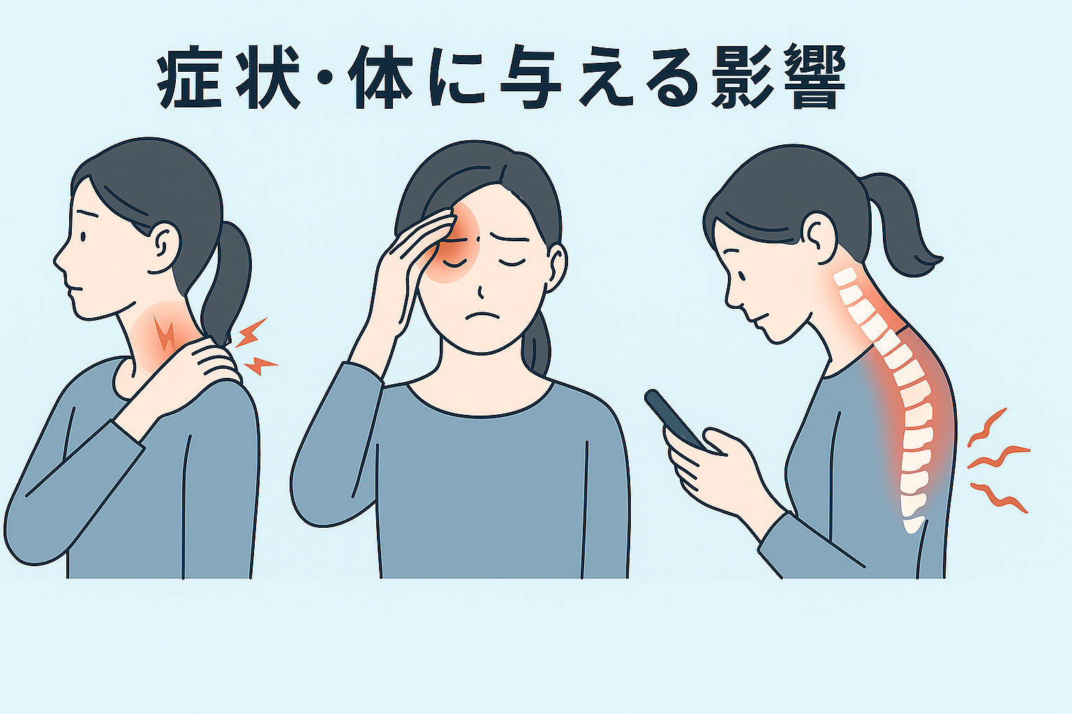 首への負荷が首・肩こり、頭痛、めまい、腕や手指のしびれといった具体的な症状につながることもあるのです。たとえば、筋肉が常に緊張状態にあると血流が悪くなり、いわゆる「緊張型頭痛」が起こるケースが報告されています。