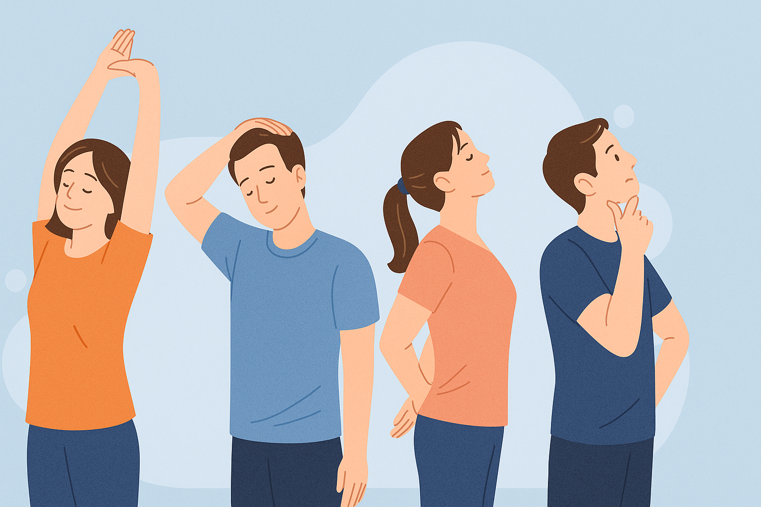 たとえば、椅子に座って背筋を伸ばし、両肩をすくめるように上げてから、ストンと下ろす動きを数回繰り返すだけでも血流が促され、首まわりの緊張をほぐしやすくなるでしょう