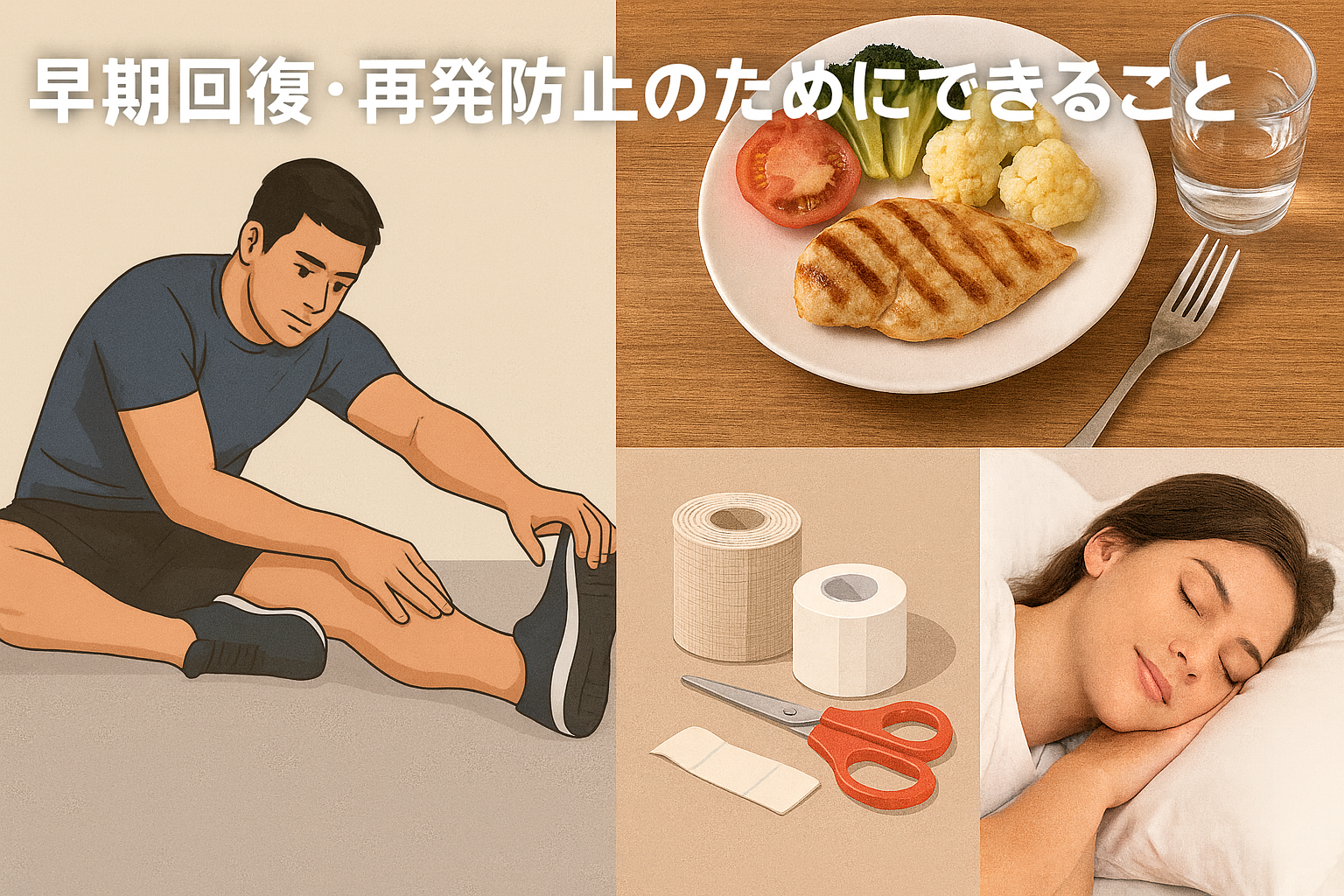 要するに、ストレッチなどの“外からのケア”に加え、日々の生活リズムや食事・休息という“内側のケア”が、肉離れを防ぐうえで欠かせない要素なのです。