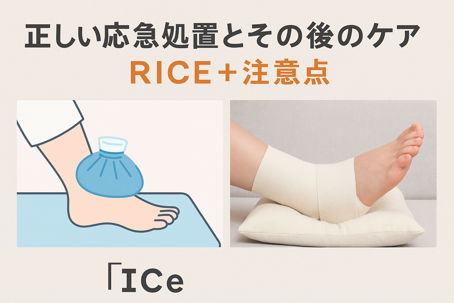 「捻挫したかも…」と思ったら、まずは RICE処置(安静/冷却/圧迫/挙上)を実践するのが定番とされています。