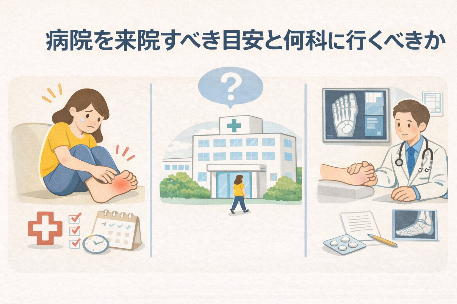 まず目安として、痛みが数日〜数週間続いている場合や、腫れ・赤み・熱感を伴う場合は受診を考えた方が良いでしょう。また、歩くたびに強い痛みが出る、安静にしていても違和感が引かないといった状態も、早めに体の状態を確認したほうがよいケースと言われています。