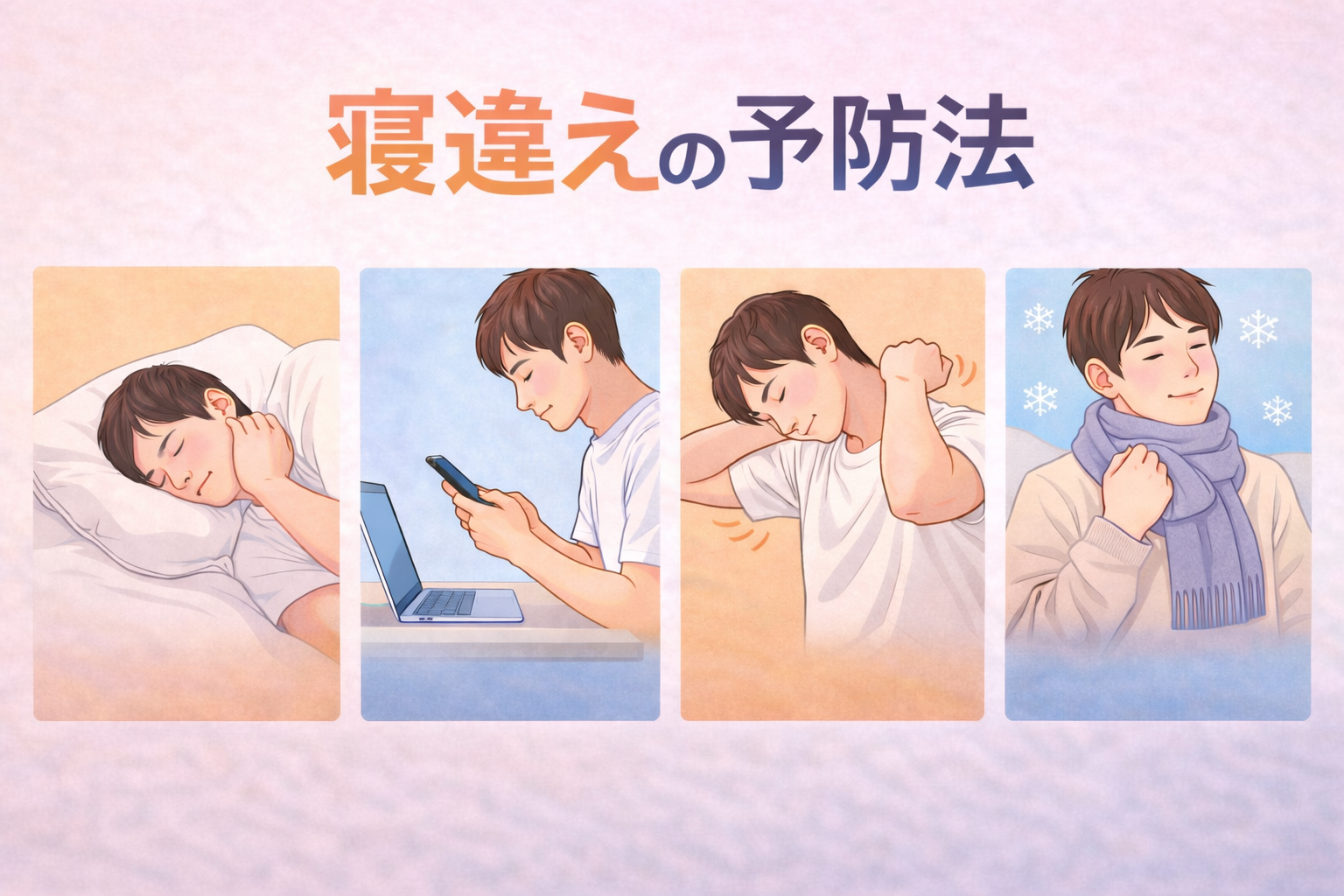 首や肩の筋肉が疲労した状態や、体が冷えて血行が悪くなっていると、寝違えが起こりやすいと言われています。