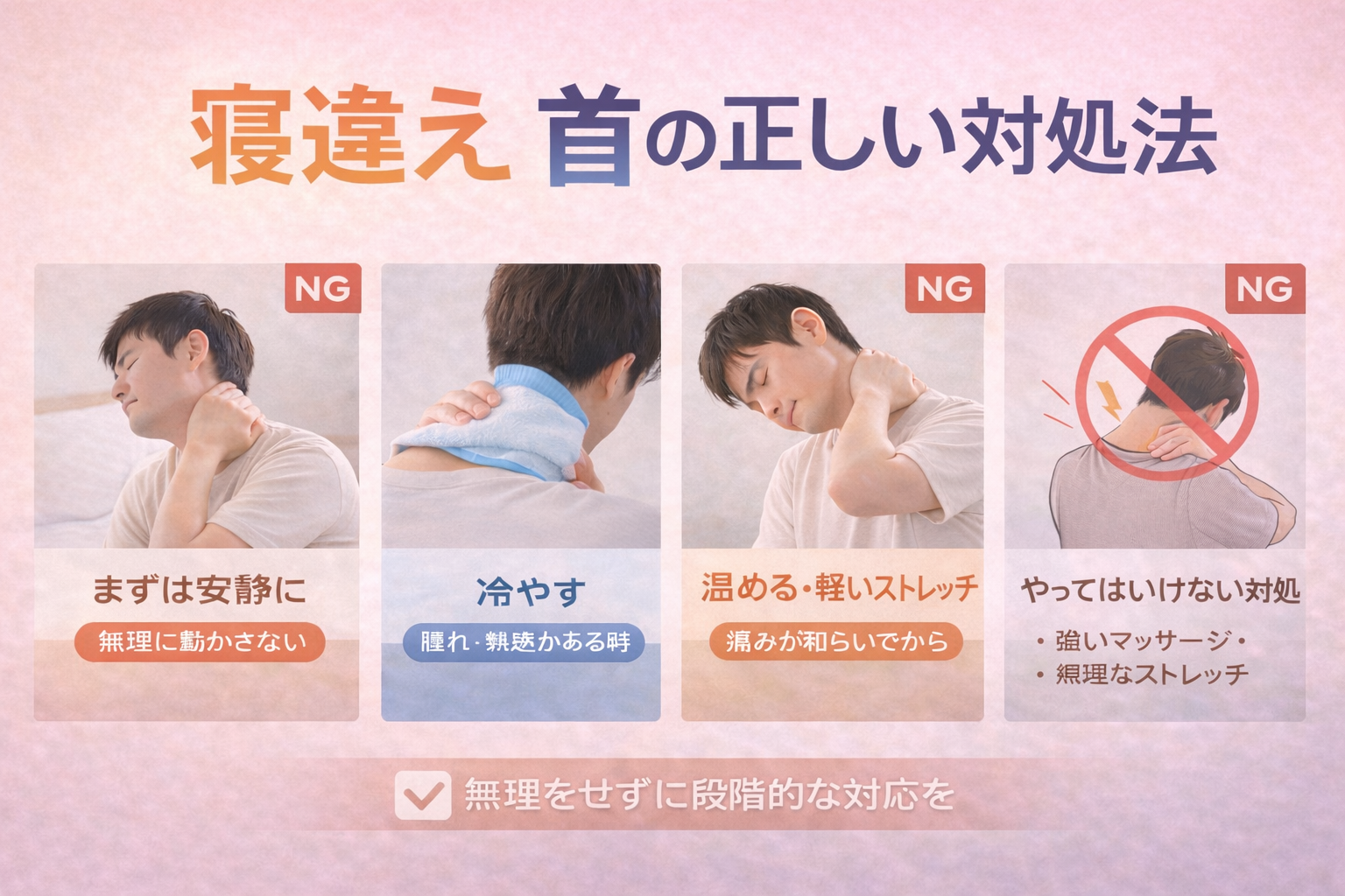 寝違え直後は首の筋肉や周辺組織が刺激を受けやすい状態のため、強く回したり伸ばしたりするとさらに痛めてしまう可能性があります。