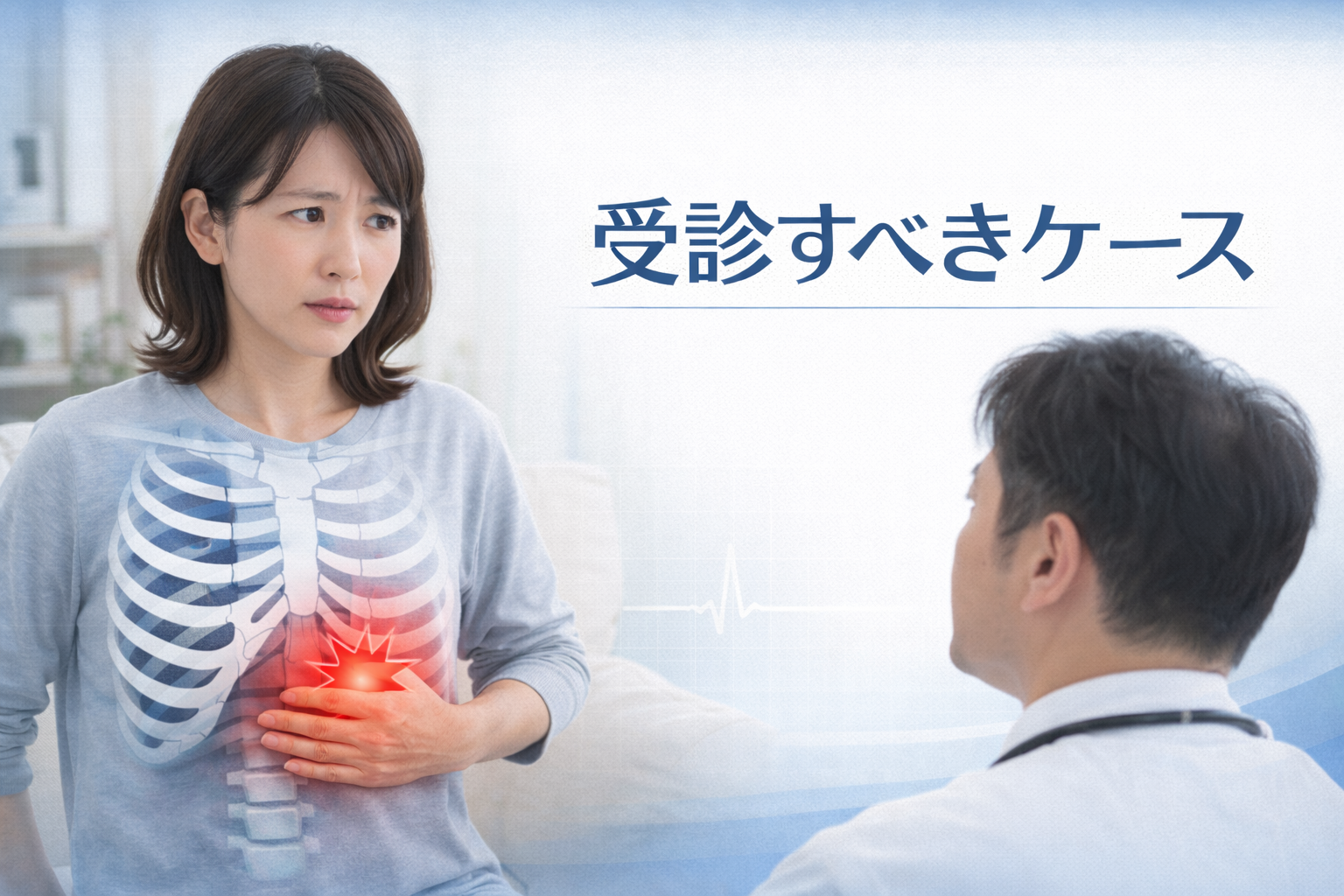 あばらの下が痛い症状は、筋肉の違和感で一時的に落ち着く場合もありますが、状況によっては受診を考えたほうがよいケースもあると言われています。