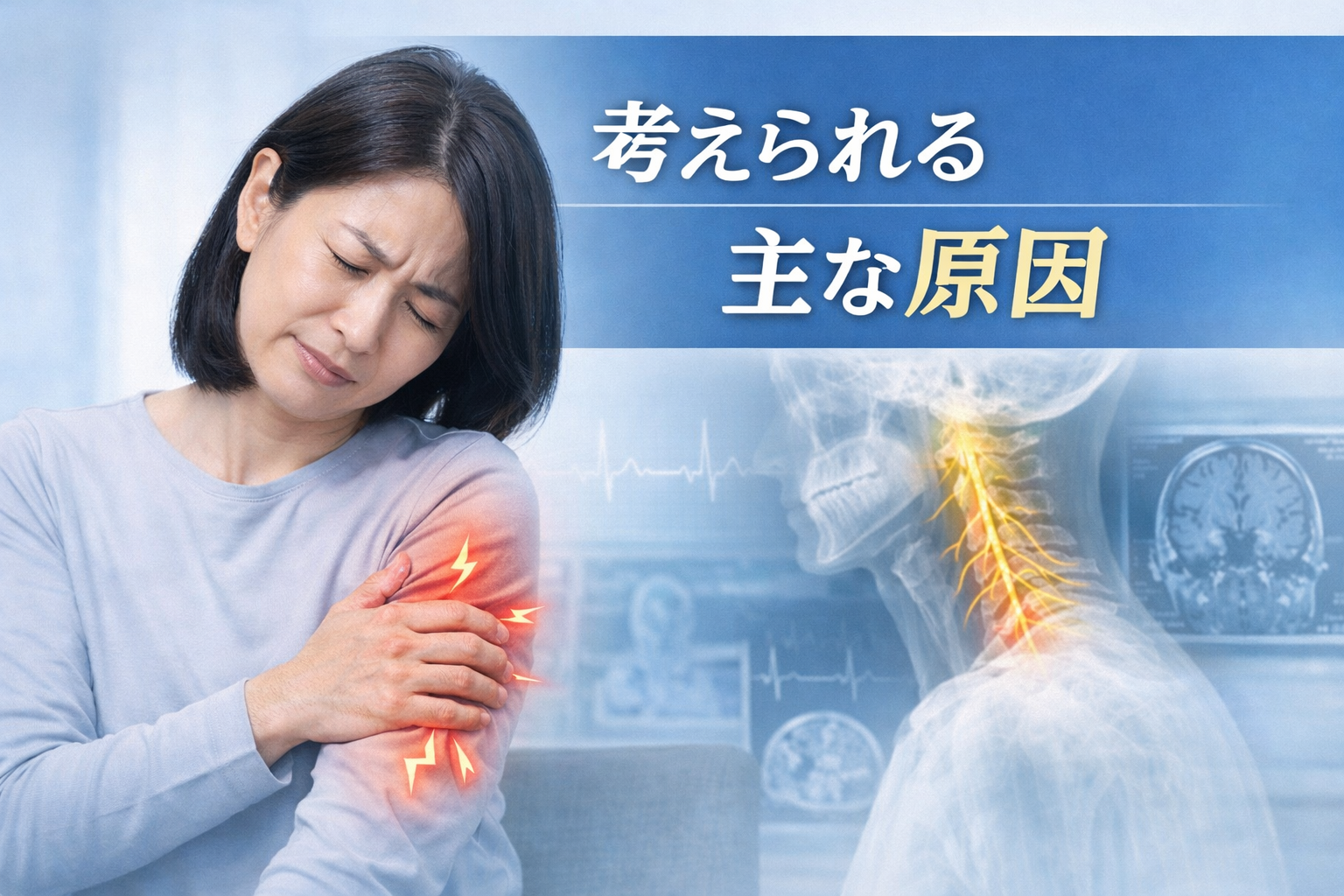 腕のしびれや痛みは、主に首や肩まわりで神経が圧迫されたり、血流が滞ったりすることで起こると考えられています。