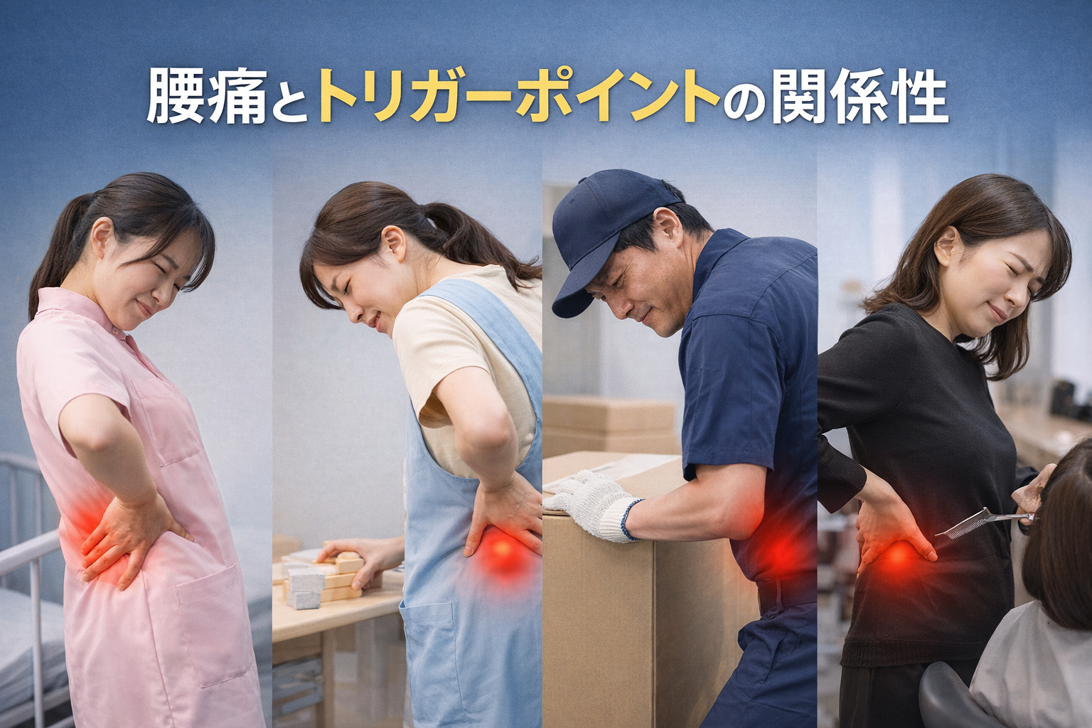 腰痛とトリガーポイントの関係を詳しく解説! 筋肉内の痛みの引き金点(トリガーポイント)が腰痛の原因になる仕組み・代表的な発生部位・セルフで見つける方法・自宅でできるほぐし方・専門的な治療法まで幅広く紹介します。