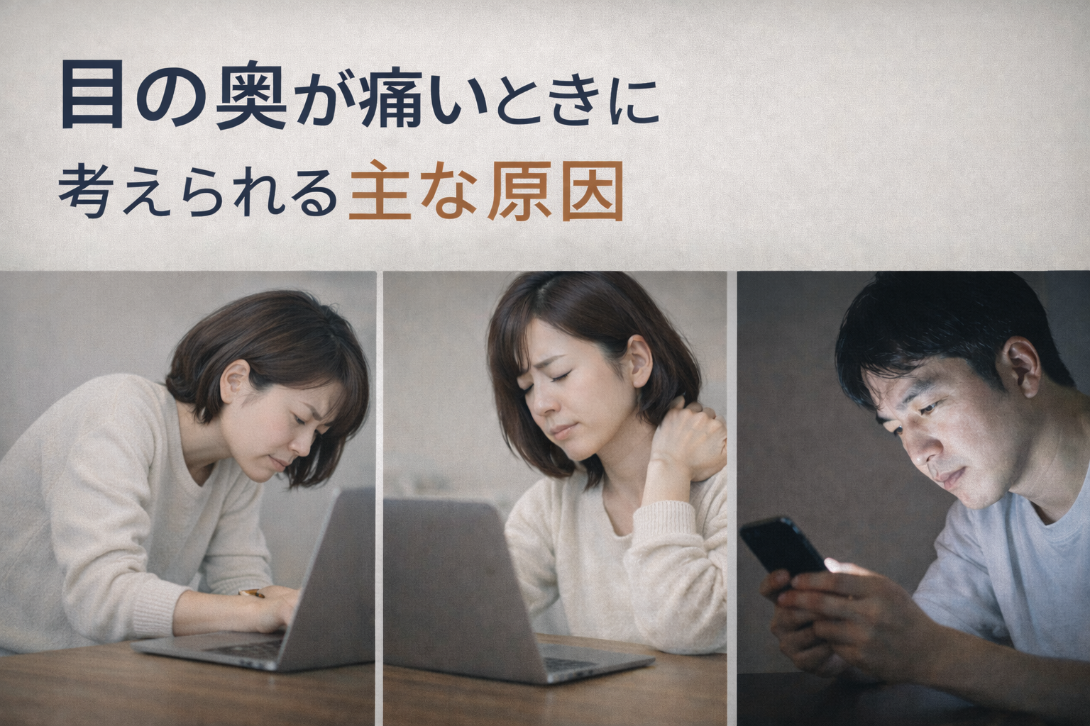 長時間の前かがみ姿勢やスマホ操作が続くと、首や肩の筋肉が緊張しやすいと言われています。その緊張が神経や血流に影響し、離れた部位である目の奥に痛みとしてあらわれることがあると紹介されています。