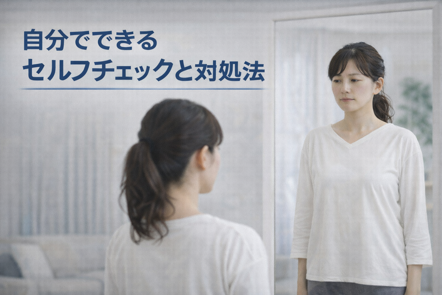 まず鏡の前に立ち、左右の肩の高さや骨盤の傾きを見てみましょう。「どちらかに体重が寄っていないか?」を意識するだけでも、姿勢の癖がわかると言われています。目を閉じて10秒立ってみて、大きく揺れる場合は平衡感覚の影響も考えられるようです。