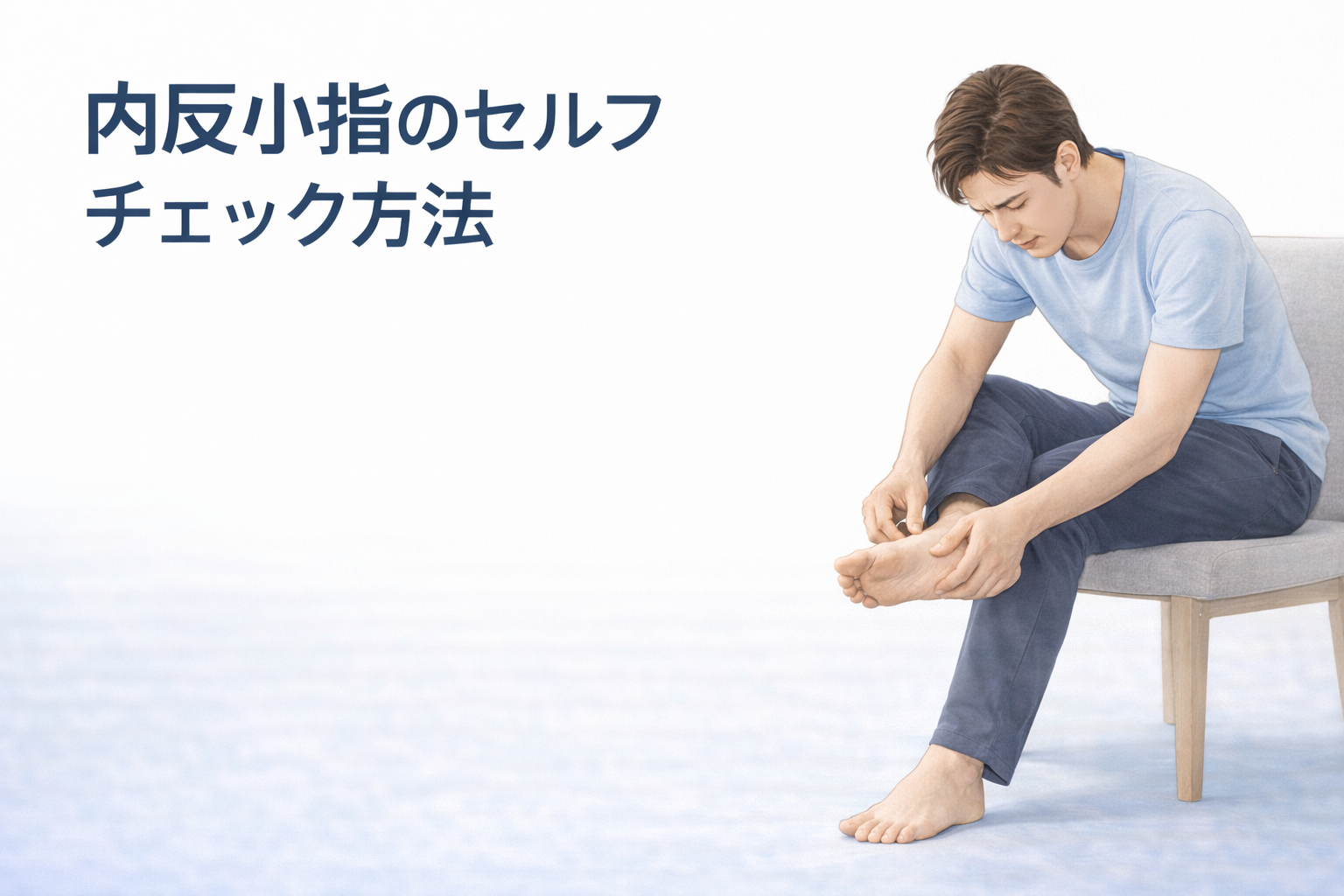 内反小指をセルフチェックするときは、椅子に座った状態で足を前に出し、小指がどの方向を向いているかを見てみましょう。左右の足を見比べてみると、違いに気づきやすい場合があります。