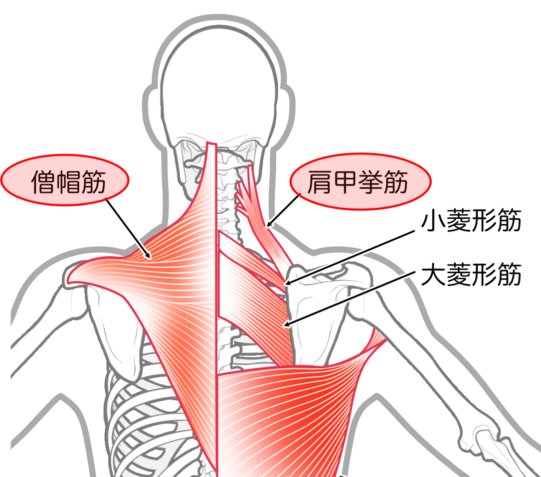 とくに僧帽筋の上部や、そのすぐ下の層にある肩甲挙筋などは、